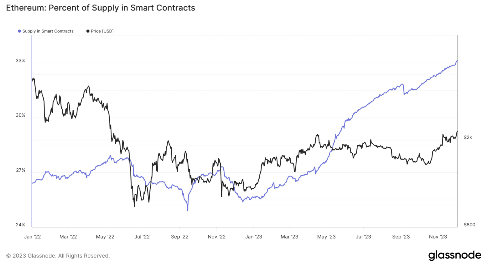 A new high was reached in November: more than 33 percent of all ETH is now locked into smart contracts. This further reduces the amount of ETH in circulation. Combined with the already declining availability of ETH on exchanges, a true supply shock is looming. If this is met with increased demand, such as through ETF purchases, the price of ETH could rise.